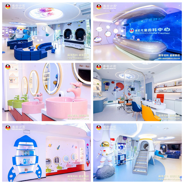 德伦口腔儿童齿科旗舰中心,全新太空遨游主题就诊空间,从入院到就诊全程皆有太空宇航元素,触动孩子好奇心。设有太空闯关乐园、小小牙医游园会等多项游戏环节,诊室内可播放小朋友喜爱的动画片,让孩子放松适应,孩子看牙全程寓“治”于乐,在游戏中快乐看牙。