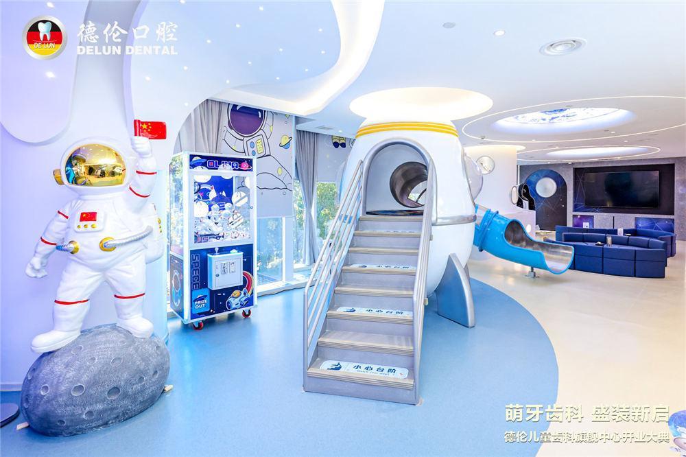 新开业的德伦口腔儿童齿科旗舰中心院内占地面积约 1500m ,拥有 18 个诊室、综合儿童活动区、咨询室、诊室、拍片室等多个功能区域。区别于传统的口腔机构,德伦口腔儿童齿科旗舰中心充分考虑孩子的看牙心理,全新太空遨游主题就诊空间,设有太空闯关乐园、小小牙医游园会等多项游戏环节,设置了多处阅读角,配置超过 200 本的儿童看牙绘本与护眼阅读机,让孩子沉浸式放松看牙 , 同时还能收获健康知识!诊室内也有小朋友喜爱的动画片,让孩子放松适应,看牙全程寓 " 教 " 于治,寓 " 治 " 于乐,在游戏中快乐看牙。