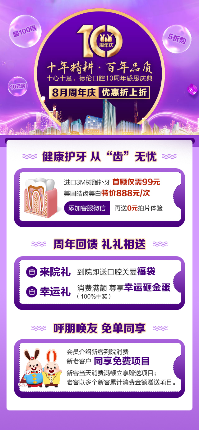 7-8月,德伦口腔将迎来10周年感恩庆典,为回馈广大羊城市民的支持,德伦口腔将针对所有爱牙市民开设“福利层层叠,只为全心回馈你”福利,同时还有更多优惠放出!