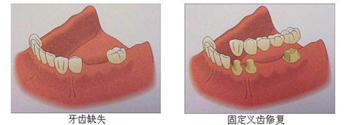固定假牙在医学上称固定义齿或固定桥。它是利用缺牙间隙相邻两侧好牙把假牙固定其上。尤如造大桥必须要有稳固的桥基一样,患者自己不能自行取戴。这种假牙的制造方法是先将两端的基牙(作为基础的牙)磨去一部分,然后制造一个金属冠套套在基牙上,再用另一个金属杆,把两端连接起来,中间是塑胶牙。它的优点是体积小,舒适,无异物感,装入口腔后容易习惯;咀嚼功能比活动假牙要大。缺点是两端基牙的条件要好,在制备时,还要磨除许多基牙,费时,对医生制备要求条件较高,有些游医做的这类牙齿是肯定达不到科学标准的。有些人常因磨牙带来的酸痛而不欢迎固定假牙,另外,固定牙有个金属冠套也不美观,失牙不能过多,以1~2个牙齿缺失为宜。目前国内广泛开展烤瓷牙,色泽是非常理想的,就是费用较高。