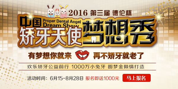 而期待已久的2016德伦杯也于这个6月强势归来,不管你是有牙齿矫正需求的牙友,还是想展现自我、想要实现梦想的人,都可以报名来秀! 6月15日——8月20日正式进入招募,我搭平台,你圆梦,实现就要现在。