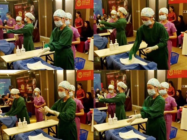 主持人介绍完本次活动的竞赛规则后,每个队的成员都表现出兴致和昂扬的斗志,首进行的是竞赛的第一轮环节——操作竞赛环节,每个队的成员紧张有序的进场,动作利落娴熟,这得益于德伦每位医护人员平时工作中养成的良好职业习惯,每个参赛的医护人员仔细认真地完成每个动作,把每个动作做得标准到位,展现在评委老师面前。