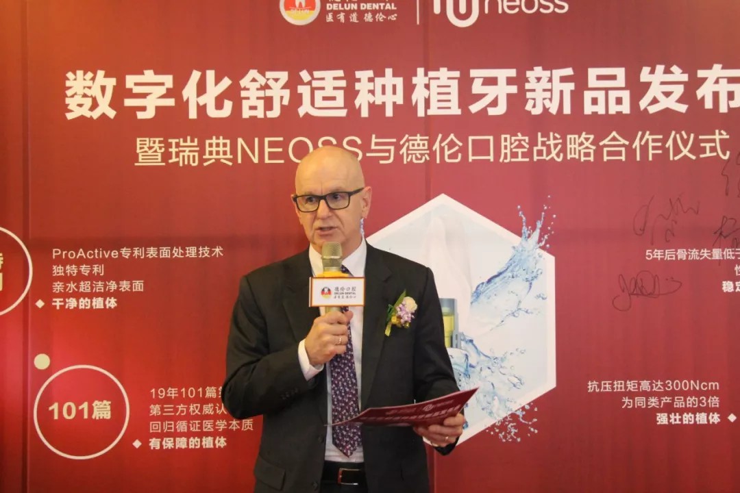 2019年12月18日,德伦口腔数字化舒适种植牙新品发布会暨瑞典NEOSS与德伦口腔战略合作仪式在德伦口腔东风总院盛大举行,瑞典NEOSS亚太副总裁JOHN教授、NEOSS中国事业部市场部总经理徐跃先生、NEOSS尼奥斯华南区负责人陈昌亮先生、德伦口腔牙周种植科主任兼集团牙周技术总监钟主任、德伦口腔东风总院口腔外科罗朝阳主任、德伦口腔集团护理部吕金英副主任、德伦口腔东风总院种植科陈医生等嘉宾出席了本次活动。