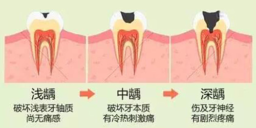 龋齿表现症状是不同的,根据龋齿破坏的程度,可分为浅龋、中龋和深龋。总的来说龋齿表现症状是由浅入深,由小到大,从没有症状到疼痛难熬,越来越严重。