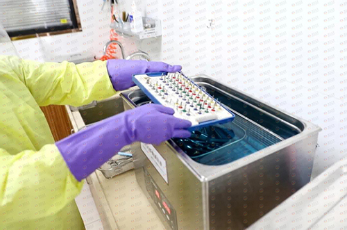 整理回收医生使用过的消毒盒、填充器、车针等器械后就能开始清洗了,而清洗有四个步骤:首先是一个简单的初洗,将装有器械的篮筐在流动水下冲洗,减少器械表面污渍;然后使用超声洗涤,将篮筐浸没于配置好的清洗剂中超声清洗数分钟;
