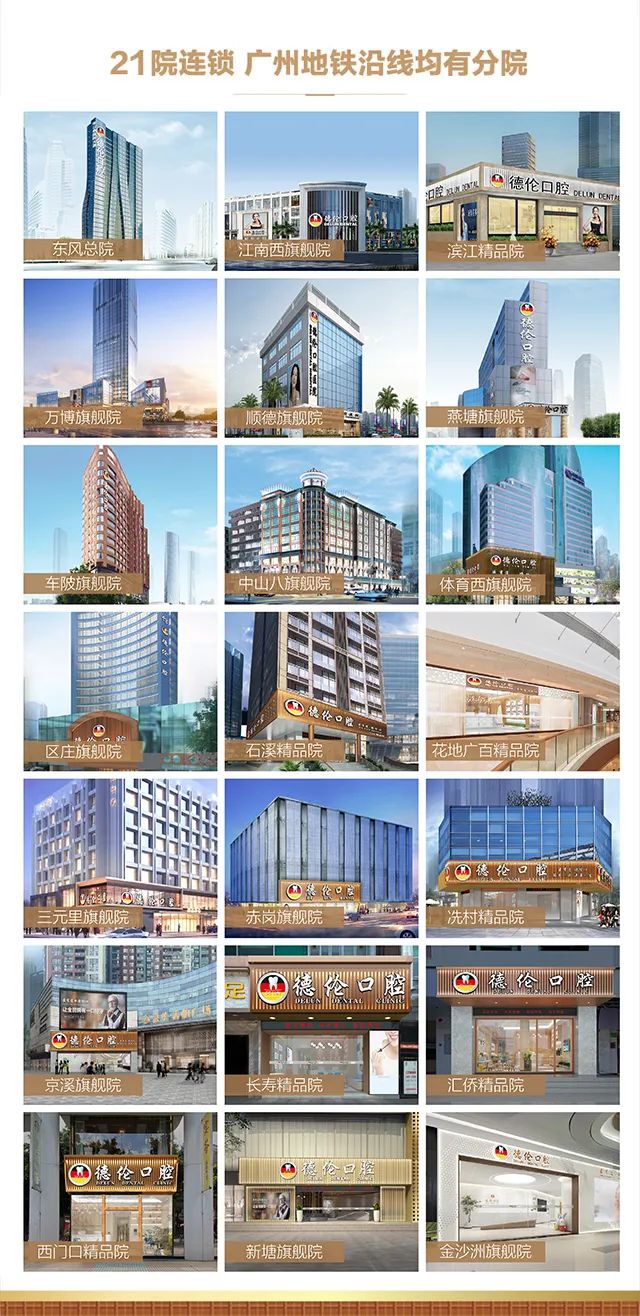 德伦口腔凭借强大的口腔连锁品牌实力,形成了大湾区连锁21院的连锁版图,横跨广州与佛山两大中心城市,满足周边市民的看牙需求,为广大市民提供“家门口”的专业家庭口腔保健与诊疗服务,随时随地享受到德伦口腔专业、便捷的口腔医疗服务。