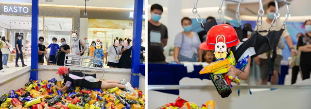 真人娃娃机,应该是大人和小孩都跃跃欲试的项目,体验时间3-5分钟,随着机器往下滑动,大手一抓,就收获满满的零食,谁看到都会说一句:“哇塞,很厉害哦。”