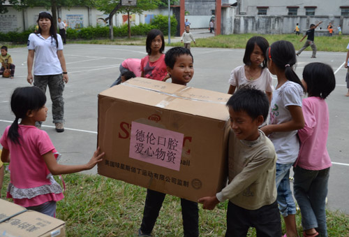 孩子们搬着德伦口腔捐赠的爱心物资,即便是满头大汗,也是不亦乐乎