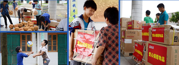 读物外,还向其捐赠日本进口理光速印一体机一台,校园广播功放机、调音台一套,还有篮球、排球、羽