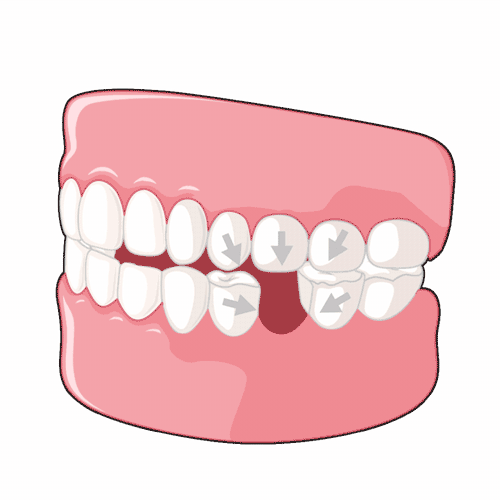 首先,缺牙不补会影响健康的邻牙,出现“缺一颗牙带坏周边牙”的现象。因为相邻的牙齿失去了“依靠”,就会一点点向着缺牙的位置倾斜。时间一久,健康的邻牙就会变歪,甚至出现松动。