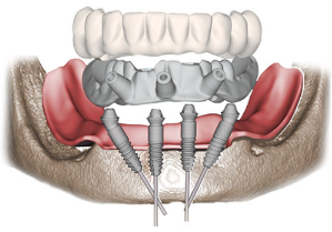 与传统种植牙相比,该技术只需植入少量种植体,也就是前牙部位的种植体垂直植入牙槽骨内,远中部位的种植体采取倾斜角度植入牙槽骨内,然后在种植体的基台上安装“拱形连桥”牙冠,这样整个种植牙的受力就呈现出“拱形”的特征。